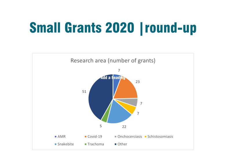 The purpose of the small grants, which are up to £5,000 each, is to enable early career researchers and global health professionals in the field of tropical medicine or global health to undertake clinical or scientific research or fieldwork, as stand-alone projects or distinct elements within larger projects.