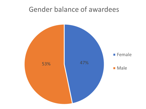 The gender split of the 932 applicants was 60% male, 40% female. For grant awardees it has narrowed to 53% male and 47% female. The gender balance is an improvement on the 2019 cohort which was 60% male and 40% female.
