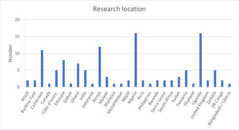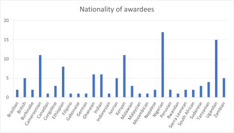 The 2020 grant awardees represented 28 countries. Of these, 82% of recipients were from across Africa. The country with the highest number of recipients is Nigeria (17), followed by Uganda (15) and Cameroon and Kenya (11 each). In 2019, UK nationals were the only Europeans to receive small grants. This year, there were five grants to those of UK nationality and one grant to an awardee of German nationality.