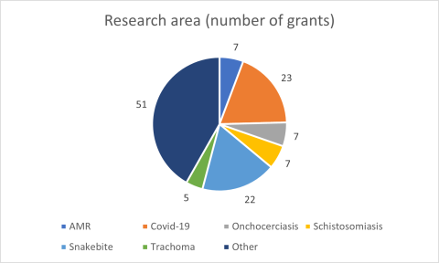 We received more than 70 applications on COVID-19-related projects and these projects were the highest number awarded (23) followed closely by snakebite projects (22 awards). There were seven awards each in the areas of antimicrobial resistance (AMR), onchocerciasis and schistosomiasis. We awarded grants across our priority areas including NTDs, malaria and planetary health. We also awarded grants in areas of multi-morbidity such as onchocerciasis alongside type 2 diabetes.