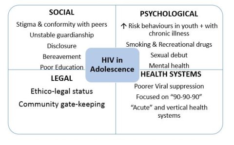 The psychosocial milieu in which adolescents with HIV live also deserves consideration. The HIV epidemic in sub-Saharan Africa has been accompanied by an “orphanhood epidemic”, which is also ageing, and therefore a large proportion of adolescents will have experienced bereavement, inconsistent care, loss of educational opportunities and having to provide care for siblings and ill family members, while dealing with their own illness.