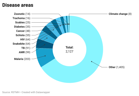 As with last year, the spectrum of disease and global health topics is very broad, and we are still working on analysing them but for now, we do have an overview of some of the frequent diseases and areas of health being looked at this year, with 203 applications on Malaria, 99 on AMR, 91 on TB, and 64 on snakebite.