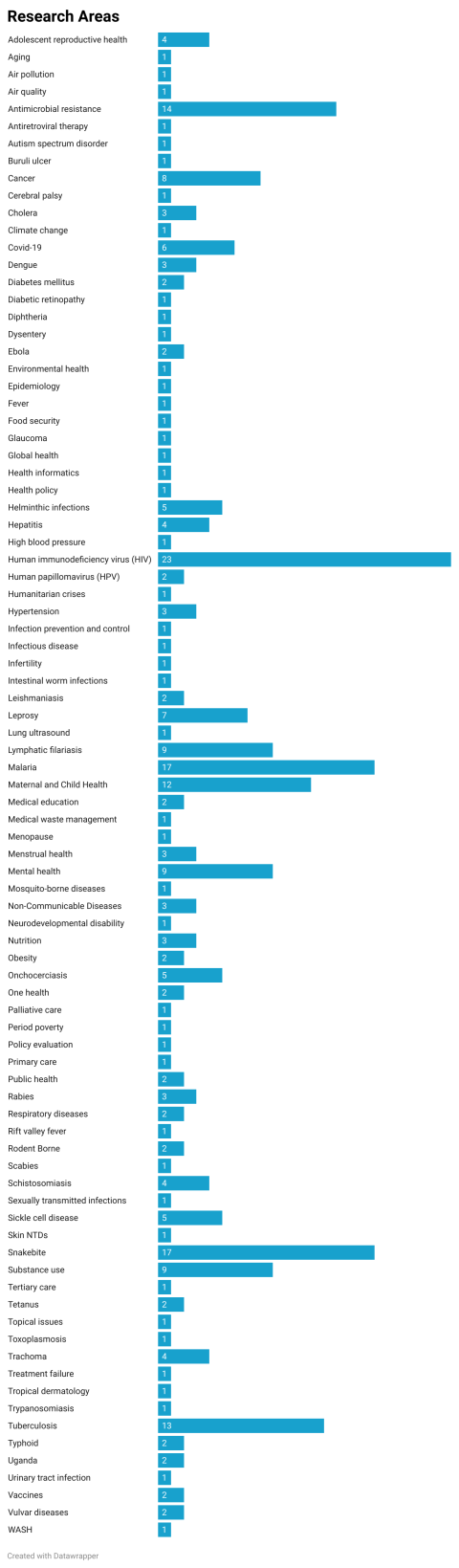 This year we were able to loosely classify the studies across 112 areas of global health, compared with 67 last year. We accept this is a very simplified view of the studies which often involve multiple disease areas or topics, and which describe their focus in different ways. The most popular topic for 2023 is HIV (23) followed by Malaria (17) and Snakebite (17) and AMR (14). We were pleased to see that around 85 projects are focused on non-communicable diseases including climate change, comorbidities, disability and mental health.