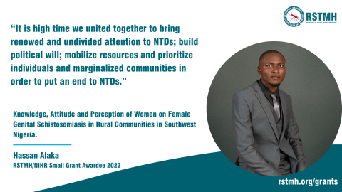 I chose to carry out my research on Female Genital Schistosomiasis (FGS) because of the knowledge and research gap on the disease in Southwest Nigeria. My aim is to carry out the research so as to bridge the research gap and contribute to the knowledge on FGS in Nigeria and globally. There is a high need to concert efforts and provide recommendations to eliminate FGS and other NTDs in accordance with the global movement to end all NTDs by 2030.