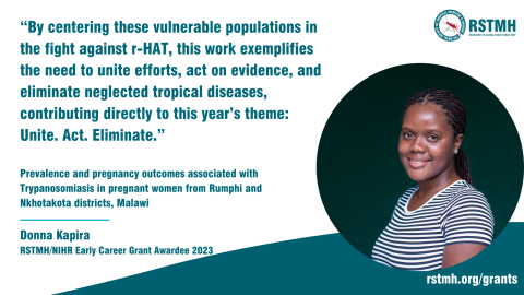 "Rhodesian Human African Trypanosomiasis (r-HAT), caused by Trypanosoma brucei rhodesiense and spread by tsetse flies, poses risks to pregnant women, yet its effects on maternal and neonatal health remain poorly understood. My research focuses on r-HAT prevalence in pregnant women in Malawi and its health outcomes, addressing a critical gap in tackling this neglected disease. By centering these vulnerable populations in the fight against r-HAT, this work exemplifies the need to unite efforts, act on evidence, and eliminate neglected tropical diseases, contributing directly to this year’s theme: Unite. Act. Eliminate."