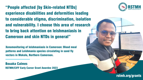 "Skin-related NTDs such as leishmaniasis (cutaneous leishmaniasis) have been relatively more “neglected” among NTDs by public health initiatives, research, and drug development. Therefore, people affected experience disabilities and deformities leading to considerable stigma, discrimination, isolation and vulnerability. I choose this area of research to bring back attention on leishmaniasis in Cameroon and skin NTDs in general. Indeed, my RSTMH project will provide knowledge on the vector-mammalian-parasite contact to help informing stakeholders and control program on the parasite transmission dynamics, which is a prerequisite and starting point for designing adequate control measures for sustainable elimination."